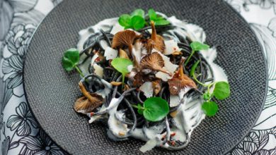 Côtes de porc aux pâtes fraîches, champignons et beurre d’ail
