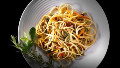 Linguine à l’orange, olives Cailletier et jambon de Parme