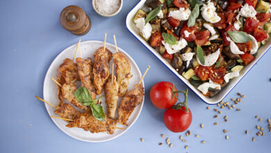 Brochettes d’aiguillettes de poulet, légumes marinés à la plancha, mozzarella
