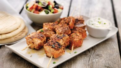 Brochette de Saumon de Norvège et sa salade Grecque