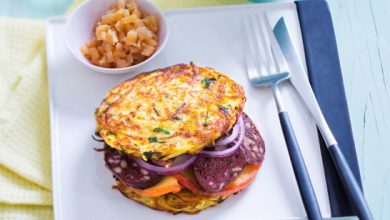 Burger au boudin noir, aux galettes de pommes de terre et aux pommes