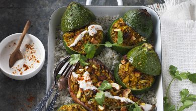 Courgettes et aubergines cuites au sel et farcies aux flocons de quinoa et “tahini” aux noix de cajou