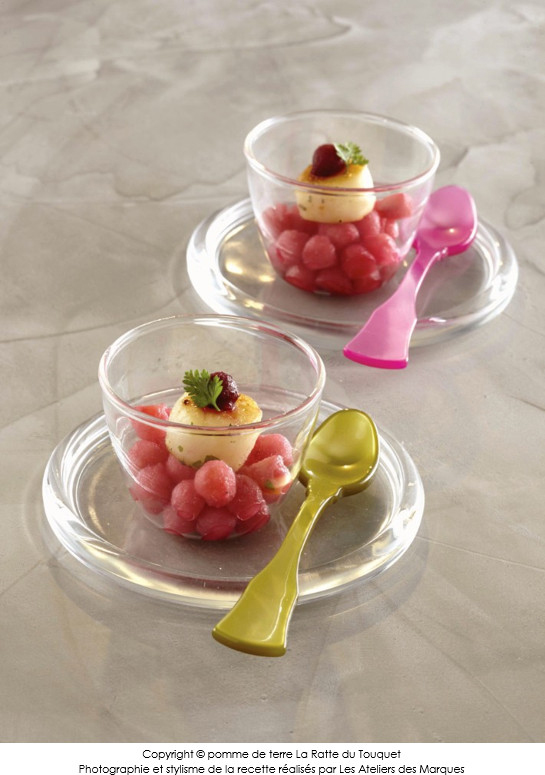 ①• Pelez et lavez les Ratte du Touquet puis coupez-les en 2 dans le sens de la longueur. Avec une cuillère à pomme parisienne, creusez des billes. Rincez-les, égouttez-les puis réservez.