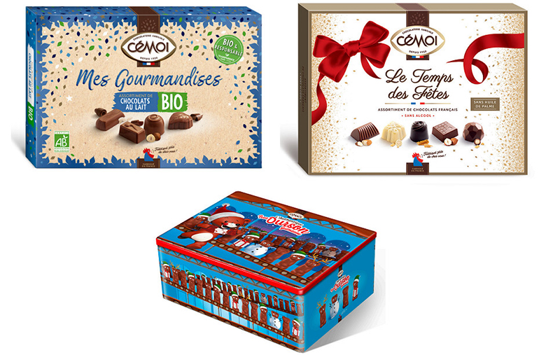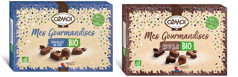 NOËL BIO : CÉMOI VOIT NOËL EN BIO ! Le chocolatier lance « Mes Gourmandises Bio », une gamme de coffrets d’assortiments de chocolats bio sans huile de palme et pur beurre de cacao. Il a également décidé de réunir ses papillotes bio les plus plébiscitées dans un nouveau sachet : « Panaché Lait & Noir ».