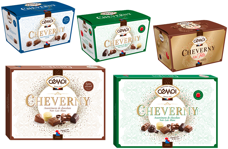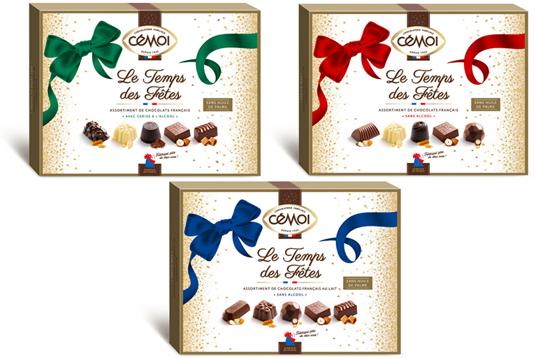 Pour varier les plaisirs et s’adapter aux goûts de chacun, CÉMOI propose 4 assortiments : des chocolats au lait, noirs et blancs, avec ou sans cerise à l’alcool. Ainsi qu’un assortiment de chocolat au lait et un assortiment de chocolats noirs. Sur la boîte, la couleur du ruban permet d’identifier facilement chaque assortiment.