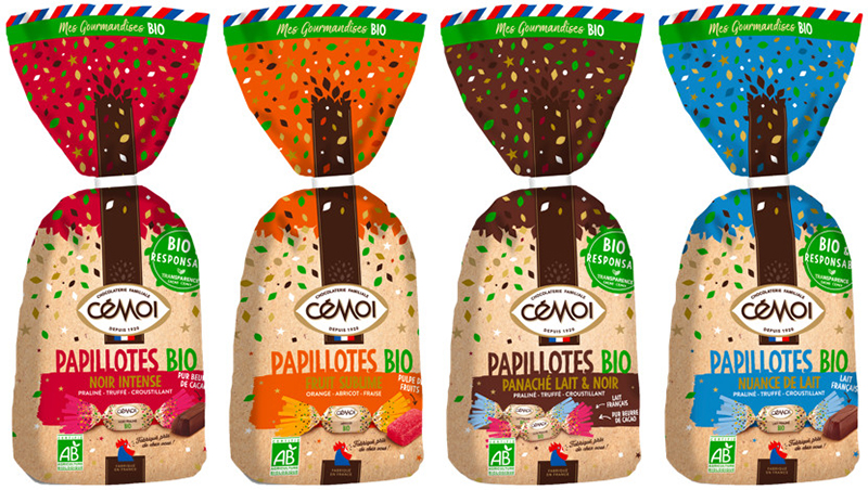« Mes Gourmandises bio », ce sont 2 coffrets festifs et colorés, l’un constitué uniquement de recettes au chocolat au lait et l’autre combinant chocolats au lait et noirs, ainsi que 4 savoureux assortiments de papillotes. Toutes les recettes sont préparées à partir d’ingrédients soigneusement sélectionnés, issus de l’agriculture biologique et fabriquées sans huile de palme. Au lait ou noir, ils plairont à tous les gourmands avec leur large choix d’inclusions : noisette entière, billettes de riz croustillant, praliné ou encore pointe de sel.