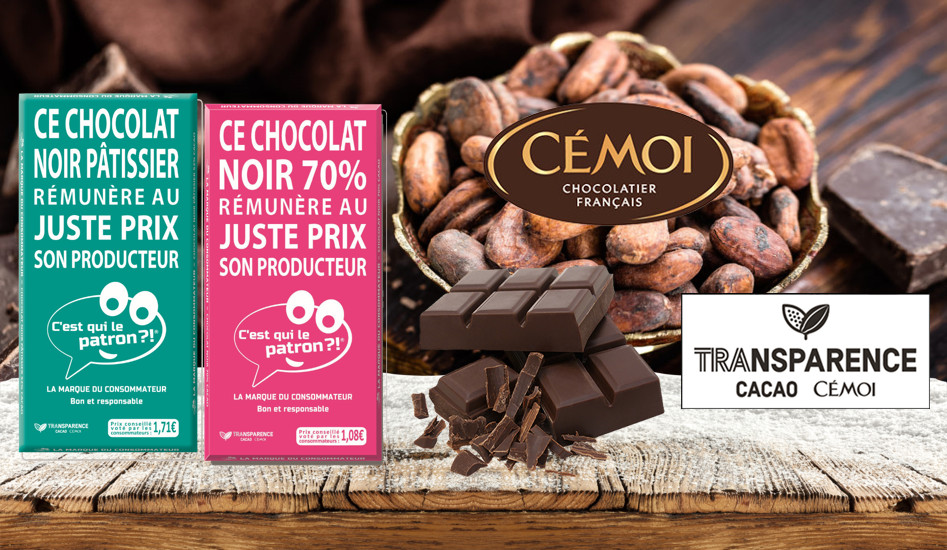 Pionnier du développement durable depuis plus de 20 ans, CÉMOI a franchi une étape décisive en lançant son programme « Transparence Cacao » en 2015. Du planteur au consommateur, CÉMOI s’engage à fournir un chocolat de qualité s'appuyant sur des critères stricts de traçabilité du cacao, de qualité aromatique, de qualité de vie du planteur et de préservation de l'environnement. Des valeurs partagées par la marque « C’est qui le patron ?! », qui a fait de la juste rémunération des producteurs et des différents acteurs de la chaîne de valeur son mot d’ordre.