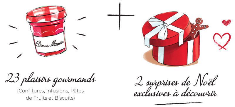Chaque jour, une douceur vous attend derrière les portes du Calendrier de l’Avent Bonne Maman. Cette année, de nouvelles recettes originales et savoureuses vont vous surprendre. Et ce n’est pas un, mais deux cadeaux inattendus qui sont à découvrir à l'intérieur ! Promenez-vous dans ce village enchanté pour découvrir la farandole de friandises qu'il cache précieusement : délicieux Biscuits, Infusions parfumées, Pâtes de Fruits savoureuses, Confitures aux saveurs inédites et exclusives… Des trésors à partager en famille, entre amis ou même entre voisins. Cette année, Bonne Maman est le témoin de vos plus beaux moments de complicité.