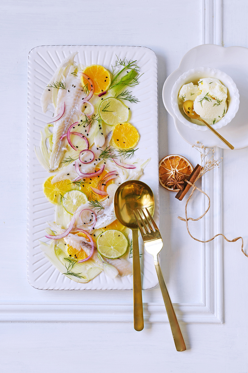 Ceviche de daurade au fenouil et à l’orange, glace yaourt-aneth