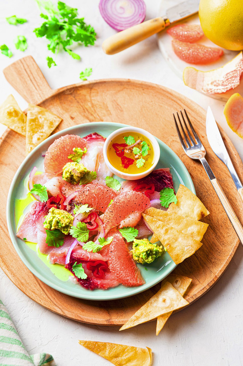 Finissez par les suprêmes de pamplemousse de Floride et les tortillas frites.