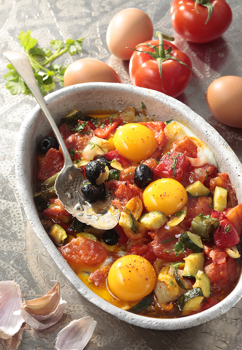 ⑤• À la sortie du four, casser les œufs sur la Chakchouka. Ils cuiront doucement à la chaleur des légumes.