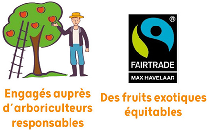 Les mangues et les bananes sont certifiées Agriculture Biologique ET sont issues du commerce équitable avec le label Max Havelaar. Le label Max Havelaar garantit notamment une juste rémunération des producteurs et travailleurs, des conditions de travail décentes et le respect de l’environnement.