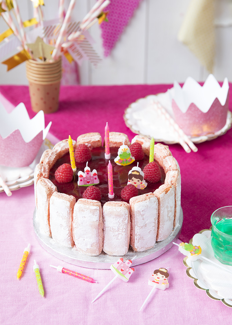 ⑦• Au moment de servir, démoulez la charlotte et napper la mousse avec le coulis framboise, disposer quelques framboises fraîches.