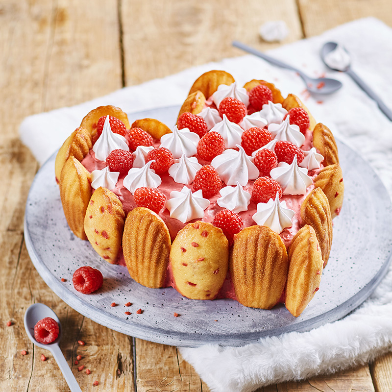 Cette très belle charlotte cœur framboises offre une recette fruitée et une parure raffinée…