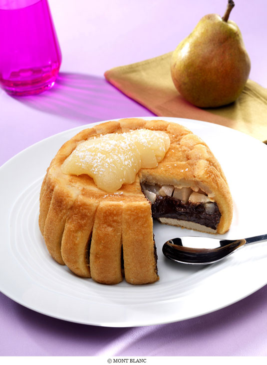 4• Répartissez les dès de poires dans le fond et recouvrez-les de crème dessert Mont Blanc Chocolat noir.
