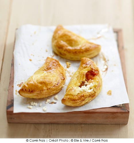 3• Déroulez la pâte feuilletée. À l’aide d’un emporte-pièce ou d’un bol retourné, découpez 4 cercles de pâte. Déposez sur la moitié d’un cercle 1 belle cuillerée à soupe de chutney de tomates, puis recouvrez de 1 Carré Frais coupé en petits morceaux. Refermez le chausson en rabattant la moitié du cercle sur l’autre. Réalisez les autres chaussons.