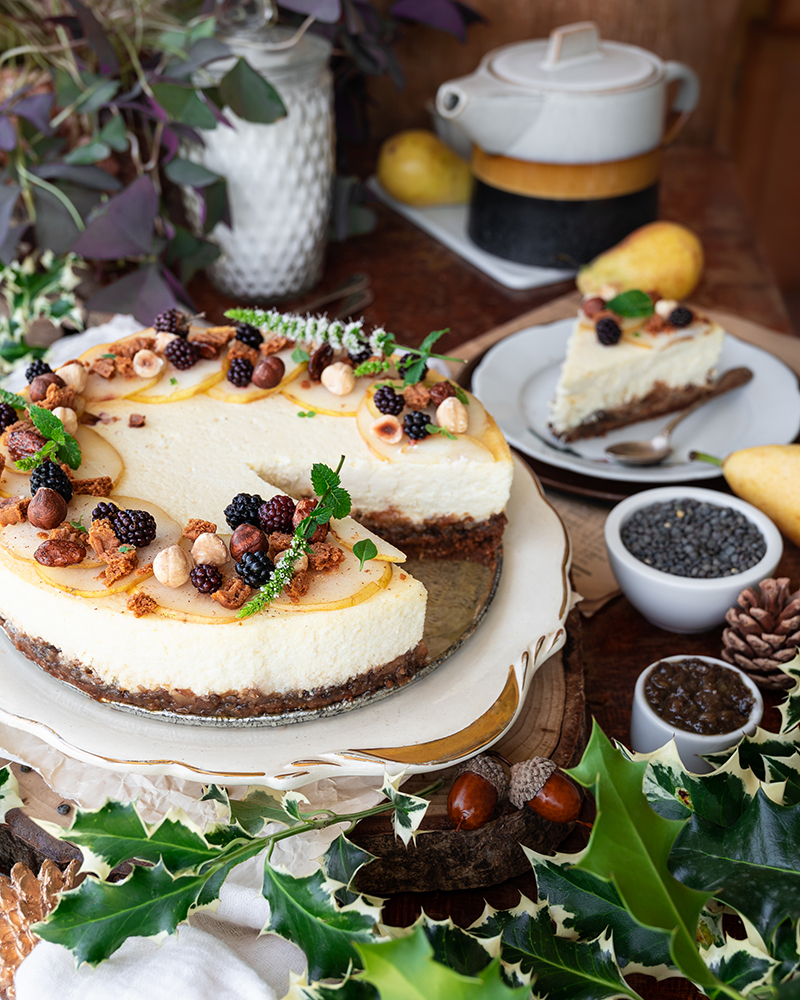 Étaler le confit de lentilles sur le fond de biscuit en une couche homogène. Poursuivre avec les poires, puis la crème au fromage frais. Lisser la surface.