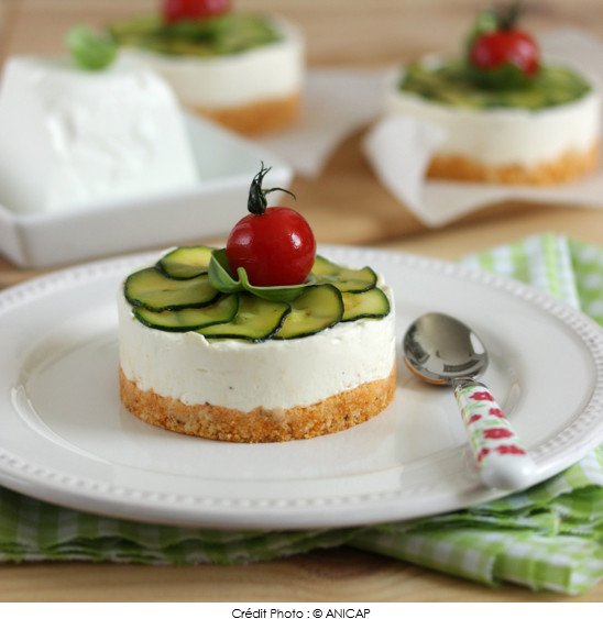 ④• Démouler les cheesecakes. Disposer des tranches de courgettes, poser une feuille de basilic et finir par une tomate.