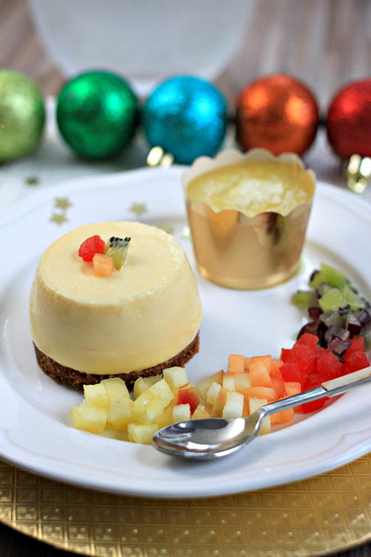 Servir avec le coulis d’ananas et des fruits du plateau de fruits recoupés en petits dés.