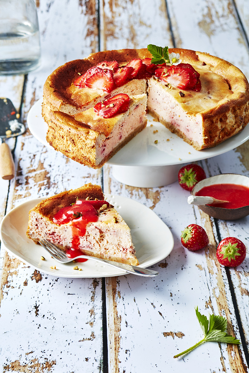 Cheesecake aux fraises rondes, pistaches et graines de pavot