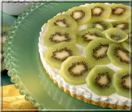 16.Démouler le cheesecake avec précaution sur un plat de service et décorer le dessus avec les rondelles de kiwis.