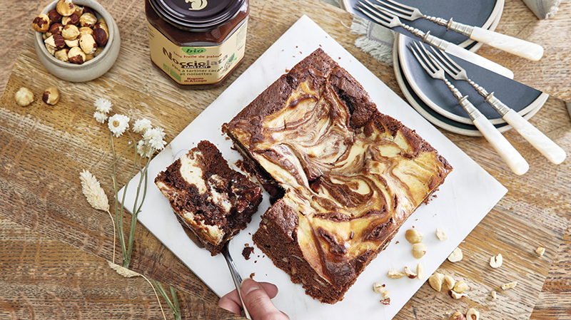 Versez-y la pâte chocolatée puis versez celle du cheesecake. À l’aide d’une cuillère, réalisez des tourbillons.