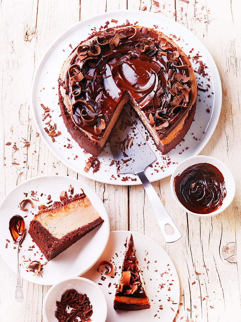 Versez sur le dessus du cheesecake, laissez légèrement durcir, parsemez de copeaux de chocolat puis servez.
