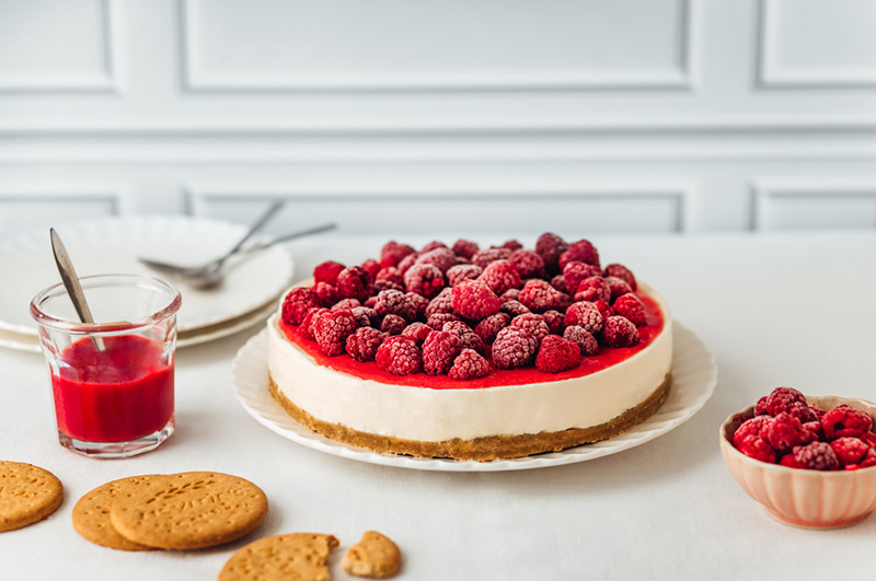 Au moment de servir, nappez le cheesecake de coulis puis ajoutez délicatement les framboises par-dessus.