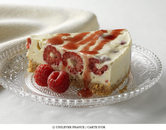 7• Recouvrez de coulis à la framboise chaque part et décorez avec les framboises entières.