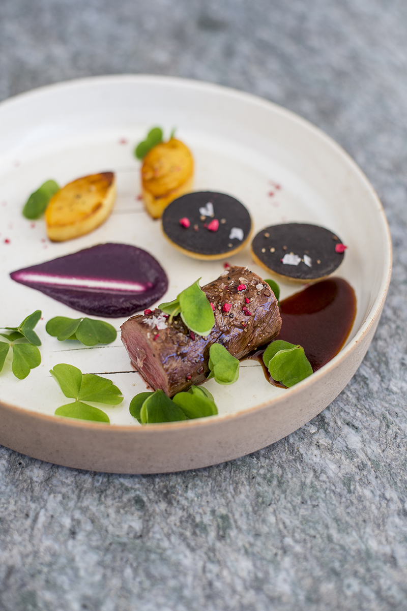 ≻ Disposer sur l’assiette : la tartelette, un trait de purée cardinal, le coulis mûre, l’oignon, le filet de chevreuil.