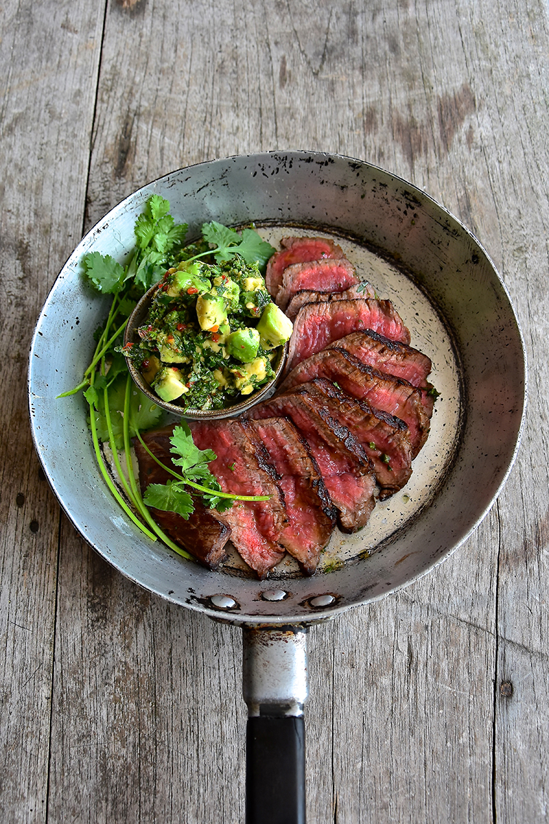 Servez sur une assiette (ou comme sur la photo directement dans la poêle), avec le chimichurri frais et quelques brins de coriandre.