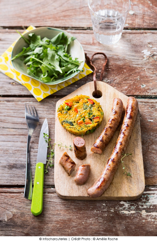 Servez les chipolatas grillées accompagnées d'une croustille de légumes et d'une salade verte !