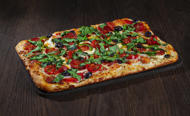 SAUCE TOMATE, MOZZARELLA, CHORIZO, POIVRONS MÉLANGÉS, TOMATES CERISES MARINÉES, OIGNONS, JEUNES POUSSES D’ÉPINARDS ET D’OLIVES NOIRES…