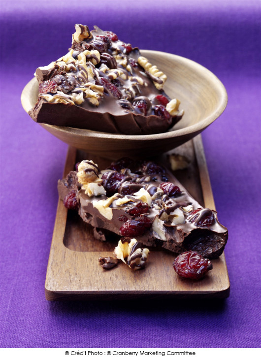 ⑤• Parsemez le chocolat avec les noix et les cranberries.