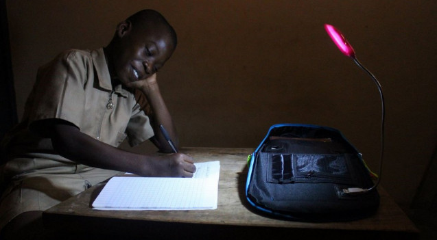 Ce cartable est composé d’un petit panneau solaire relié à une lampe permettant un éclairage autonome de 4 à 5h le soir.