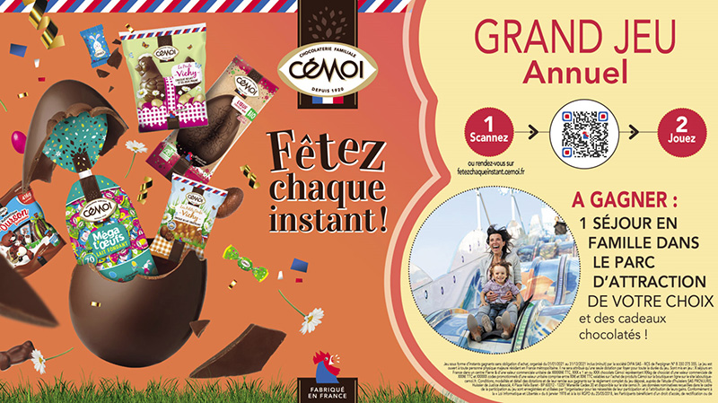 Les chocolats de Pâques de CÉMOI seront aussi très présents sur les réseaux sociaux auprès des 330k fans de la marque, et en partenariat avec des micros et macros influenceurs. CÉMOI lance une grande chasse aux oeufs interactive via son site cemoi.fr/fetezchaqueinstant. Les consommateurs auront la possibilité de gagner de nombreux lots dont un séjour en famille dans un parc d’attraction. Le principe est simple, il suffit de scanner un QR code présent en magasins ou de se rendre directement sur le site.