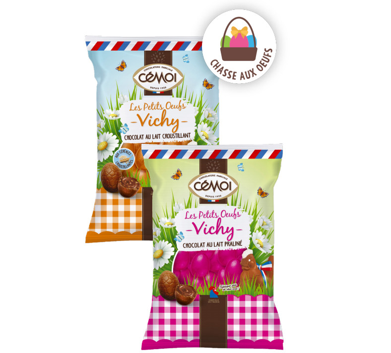 À Pâques, CÉMOI revisite l’habillage de sa gamme Vichy avec un décor frais et printanier, reprenant les codes traditionnels de Pâques, et complète son éventail avec deux nouveaux sachets d’œufs au chocolat, les grands classiques de la période. Imaginés pour la chasse aux œufs que les enfants attendent avec tant d’impatience, les deux nouveaux sachets sont fabriqués dans les ateliers CÉMOI de Troyes et déclinent chacun une recette :