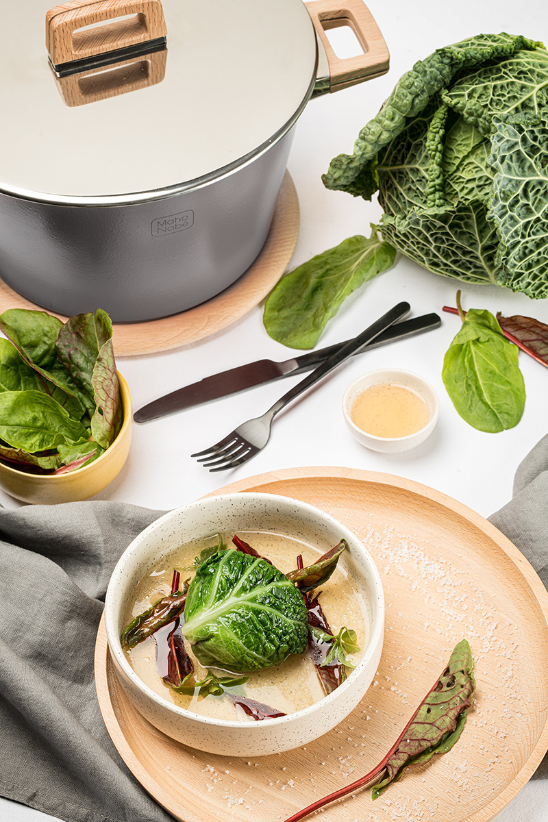 ⑥• 40 minutes avant votre déjeuner ou votre diner, réchauffez les choux au beurre salé dans le Maho Nabé à feu très doux pendant 10 minutes sur le feu et 10 minutes à couvert hors du feu sur le socle en bois.
