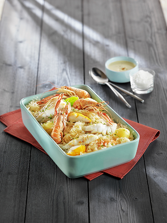 ③• Cuire les langoustines à la vapeur et réserver au chaud.