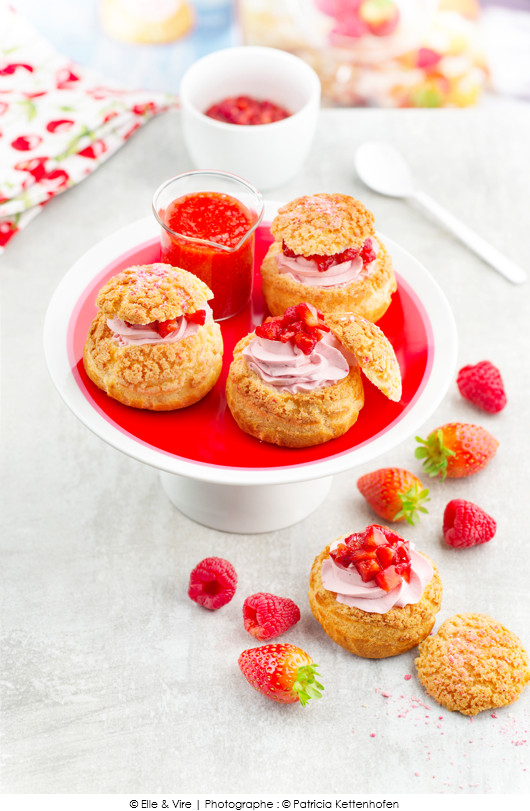 – Couper le dessus de chaque chou, réserver les chapeaux. Garnir les choux d’un peu de fruits puis de crème fouettée. Déposer le reste des fruits coupés sur le dessus, replacer les chapeaux.