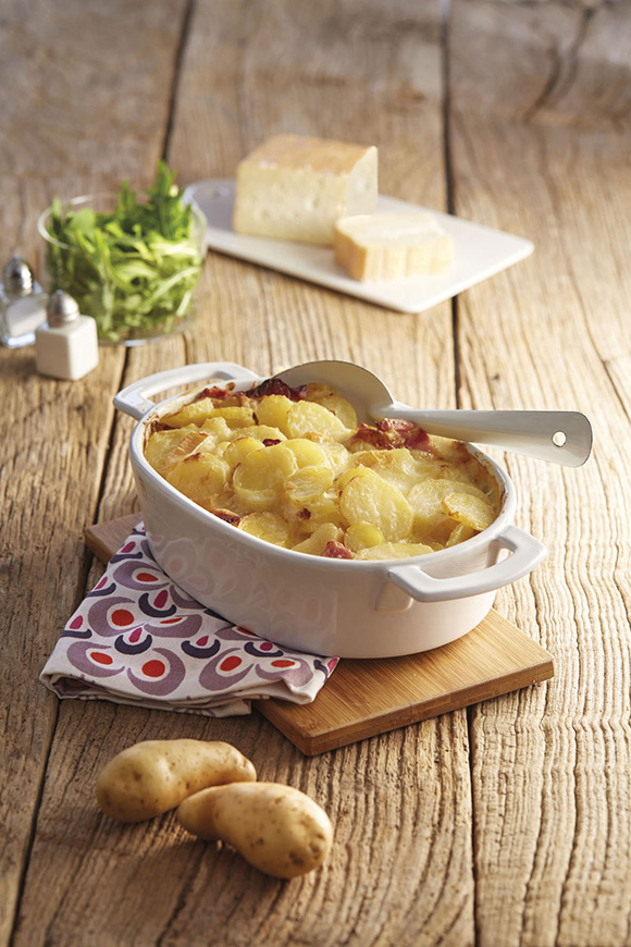 ③• DÉPOSEZ dans un plat à gratin une couche de Ratte du Touquet aux lardons et disposez au-dessus les tranches de Maroilles.