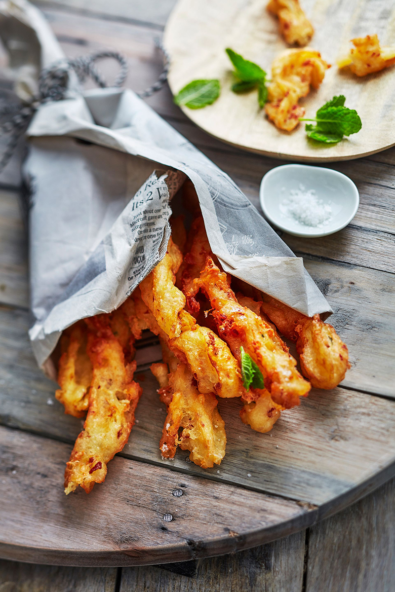 ⑧• Dans une poêle, faire chauffer l'huile à 180°C. Plonger les churros dans l'huile 4 à 5 min jusqu'à ce qu'ils soient bien dorés en les retournant à mi-cuisson. Les égoutter et les placer sur un papier absorbant.