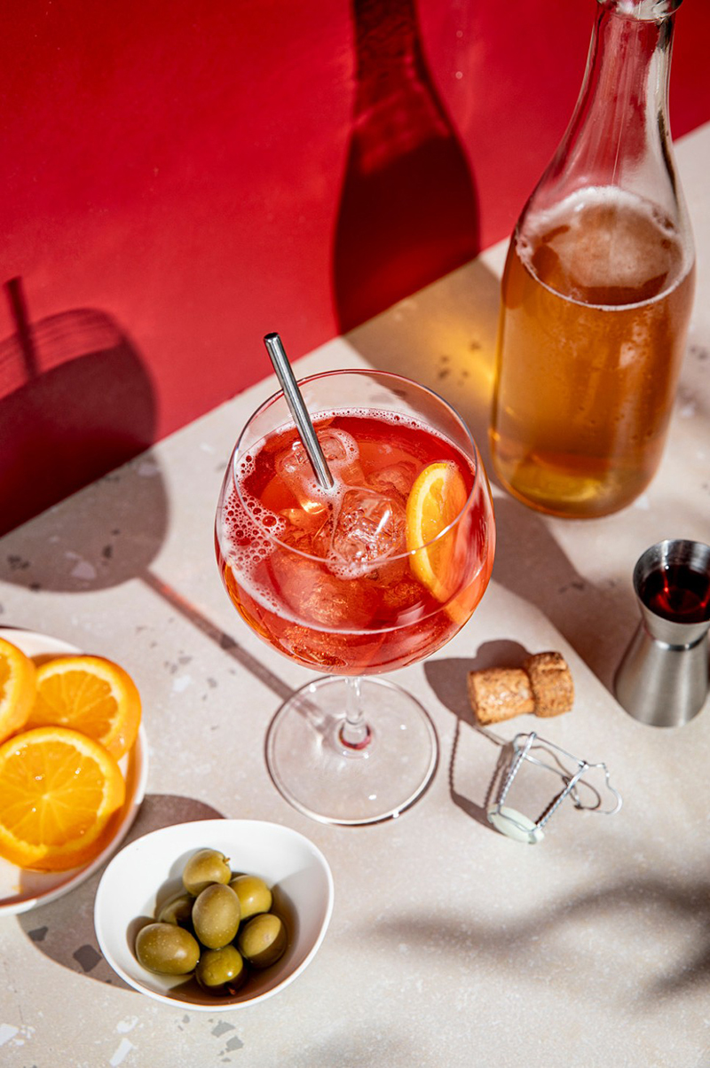 Ajouter glaçons et demi-rondelle d’orange et/ou olives vertes.