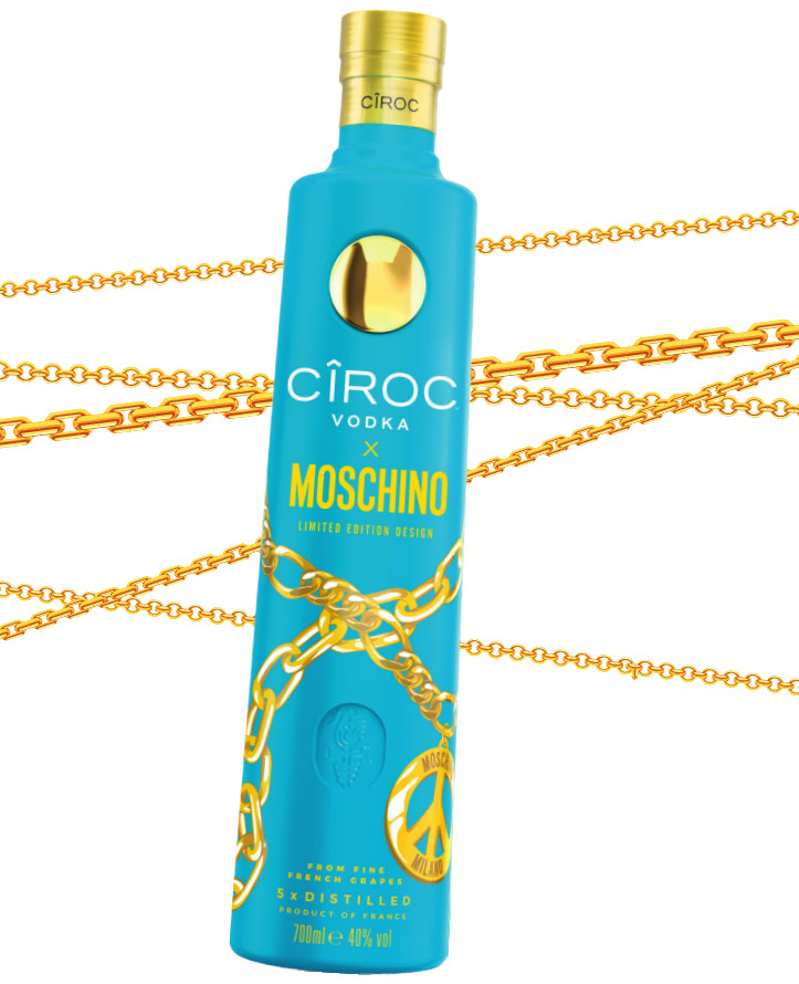 Pour le design de la bouteille CÎROC x Moschino, le parti pris créatif du célèbre styliste a été selon lui de « rassembler les chaînes emblématiques de Moschino et les lettres dorées avec la couleur bleue caractéristique de CÎROC ».