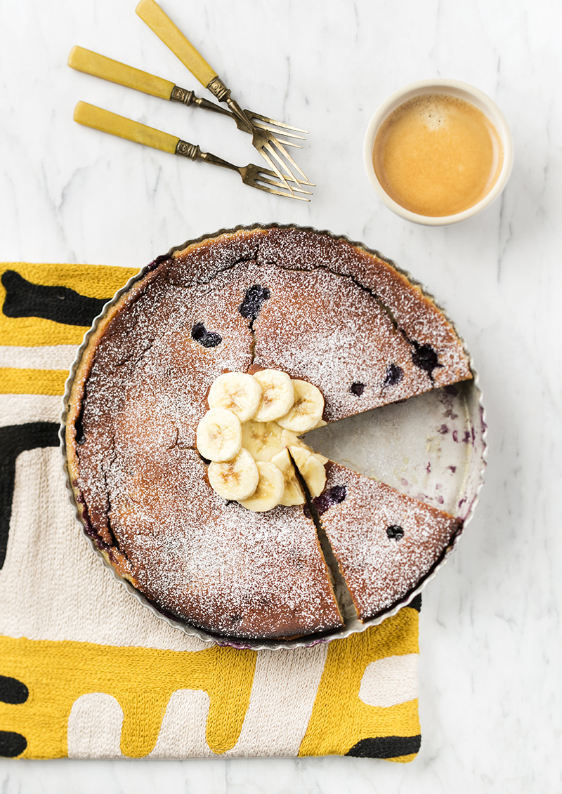 Clafoutis au lait de coco, à la banane et aux myrtilles