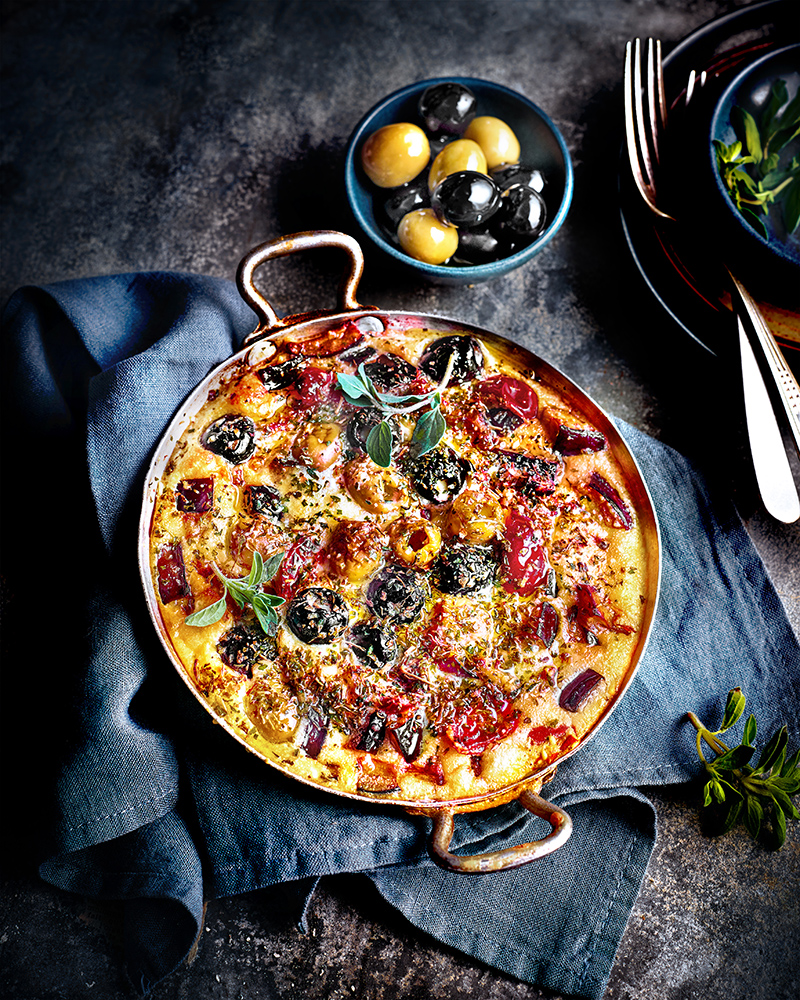– Beurrer le moule, puis disposer les aubergines et les tomates marinées dedans. Verser l’appareil sur le dessus, répartir ensuite les olives noires d’Espagne Hojiblanca entières, les aubergines et les tomates puis saupoudrer d’origan. Enfourner pendant 20 min à 25 min.