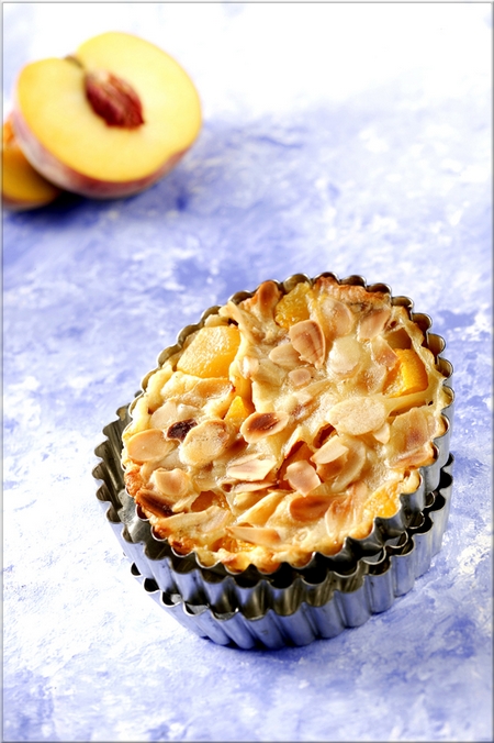 4• Beurrer des petits moules. Répartir les pêches égouttées et les amandes légèrement grillées à sec et remplir avec la préparation.
