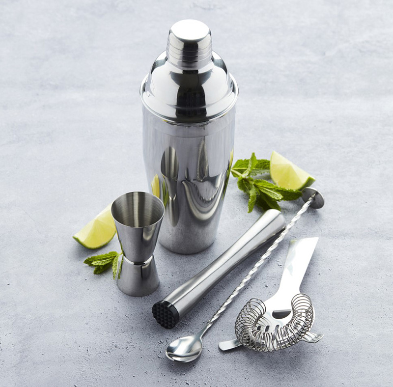 Set pour cocktails : cobbler shaker, doseur, pilon,