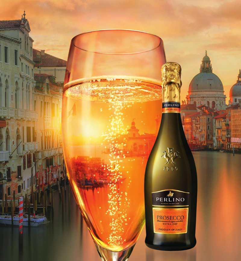 ①• Verser 12 cl de Prosecco PERLINO bien frais dans un verre à vin ou une coupe à champagne.