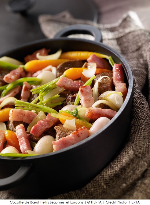 2• Faites revenir les lardons coupés gros HERTA avec l’oignon émincé puis réservez-les. Coupez le bœuf en gros morceaux, faites-le revenir dans une cocotte sur toutes ces faces puis recouvrez-le d’eau et laissez mijotez avec le bouquet garni et l’ail pendant 1h30 à couvert à feu moyen.